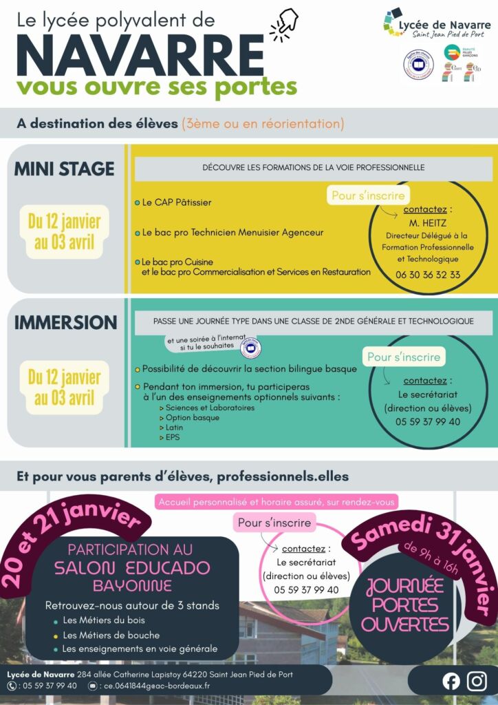 A noter que pour les élèves issus des collèges de Cambo et Hasparren, il est désormais également possible d’emprunter un transport scolaire quotidien vers le Lycée de Navarre.