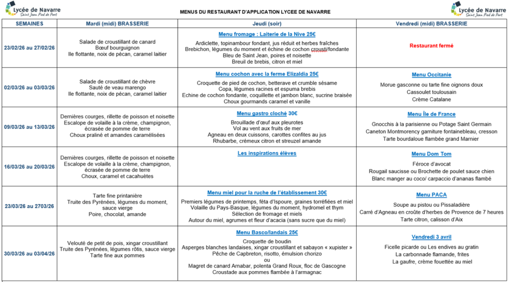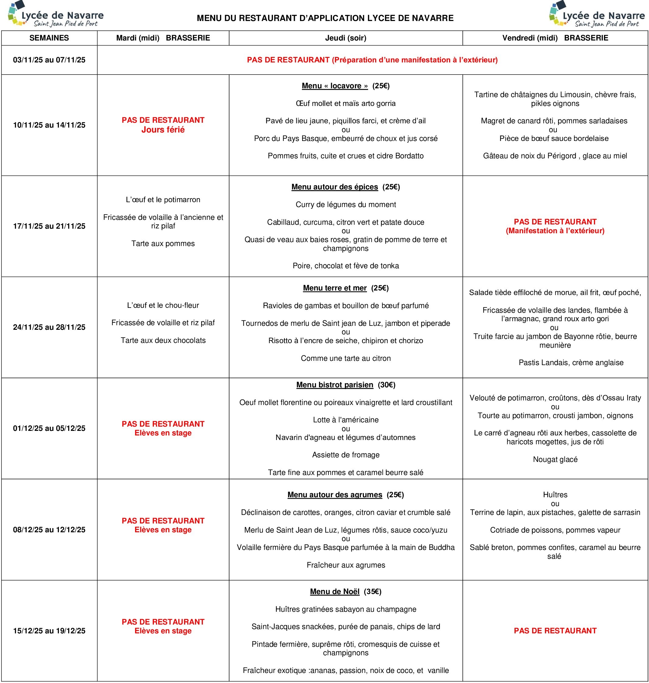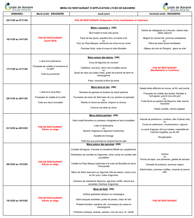 3 formules (boissons non comprises) vous sont proposées au sein du restaurant d’application :