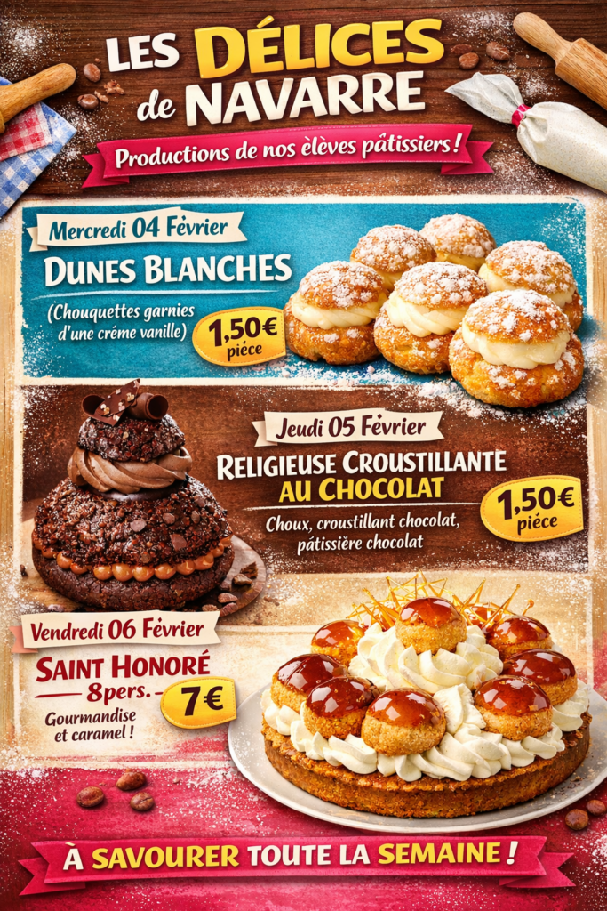 A notre boutique « Les délices de Navarre », les élèves sont mis en condition réelle de fabrication et de vente des pâtisseries réalisées. Venez les soutenir en achetant les pâtisseries !